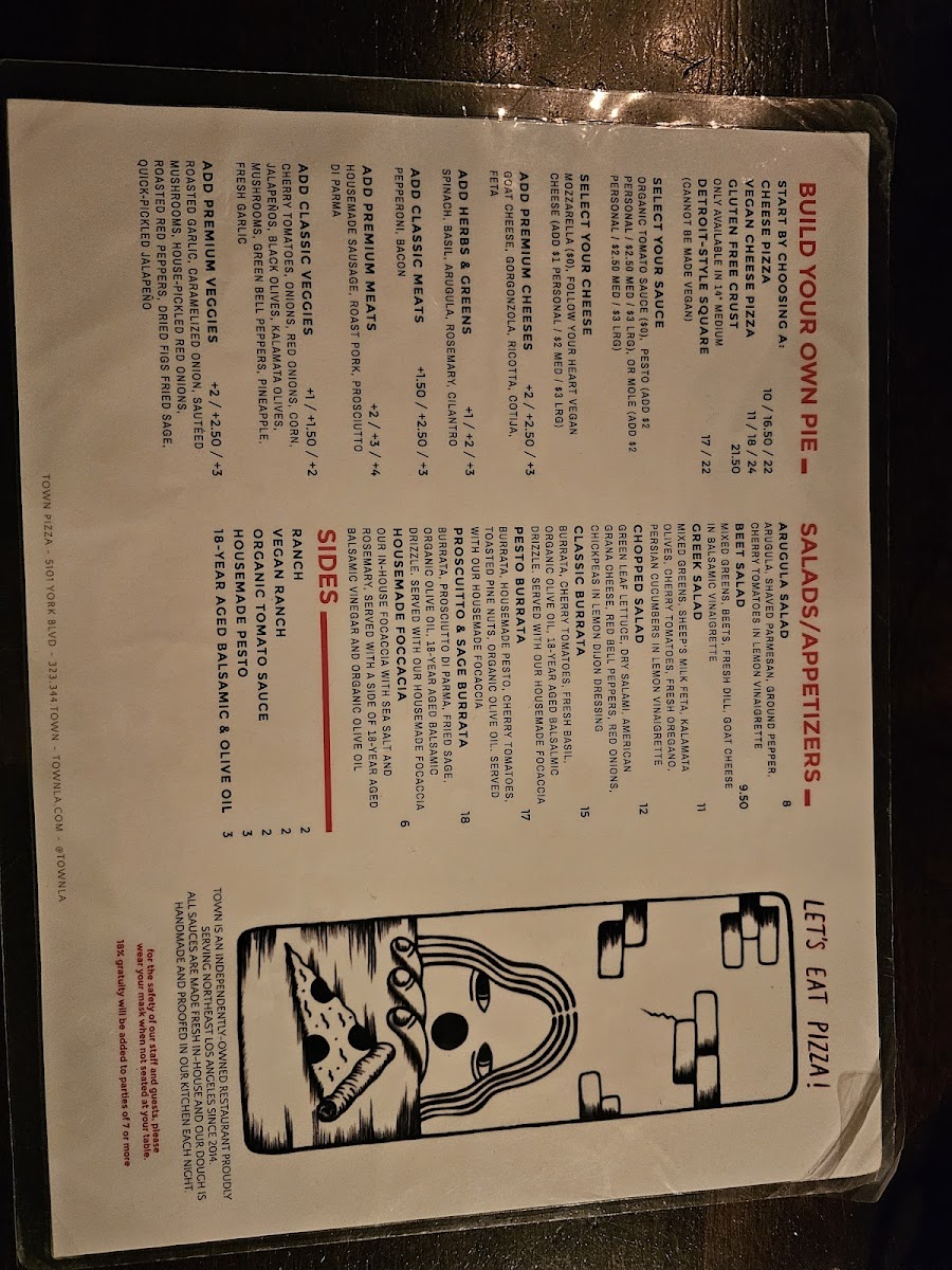 Welcome to TOWN Pizza, a delightful culinary destination nestled at 5101 York Blvd, Los Angeles. This family-friendly pizzeria caters to pizza lovers and casual diners alike, offering an impressive array of mouthwatering pizzas alongside refreshing salads.